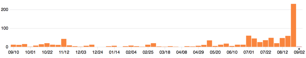 ...which clearly shows the original sprint to get the r0 of the CS API out the door at the end 2015, and then a more leisurely pace until the beginning of July 2018 since which the pace has picked up massively. Other ways of looking at include the number of open issues...